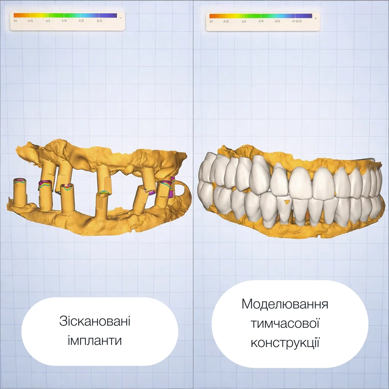 У день імплантації ставлять імплант і формувач ясен, а коронка встановлюється після періоду приживлення. Це забезпечує довговічність і природний вигляд зуба.